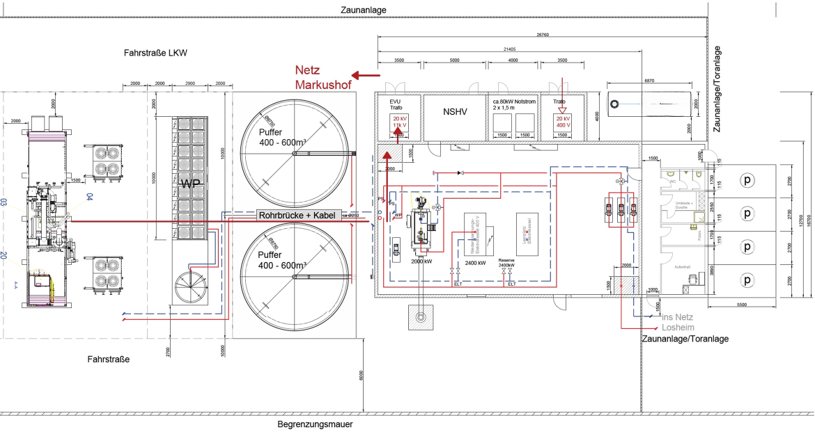Mit einer thermischen Leistung von 2.781 kWth stellt das Blockheizkraftwerk (BHKW) einen wesentlichen Bestandteil zur Wärmeversorgung dar. Die Großwärmepumpe hat eine elektrische Leistung von 313 kWel und trägt zur effizienten Nutzung von elektrischer Energie für die Wärmeproduktion bei. Mit einer thermischen Leistung von 2.000 kWth bietet der Elektrokessel eine zusätzliche Möglichkeit zur Wärmebereitstellung. Der Großwärmespeicher hat ein Volumen von 1.200 m³ und dient zur Zwischenspeicherung von Wärme, um Versorgungsschwankungen auszugleichen.